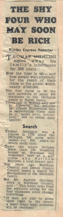The story goes back to the mid-18th century when Roger Melhuish Esq owned Northam Manor and a great deal of land around Northam and Witheridge. In order to raise money, Roger disposed of Northam Manor and a great deal of other property on a lease to run for 200 years from the death of his son William. As his son died in 1770, the lease expired in 1970, and this is the "Appledore estate". The property included a great deal of the centre of the old town of Appledore. At that time the properties should have reverted to the heirs of his other son Thomas, vicar of Witheridge. There is a memorial tablet in Northam church commemorating the lease and giving some details.