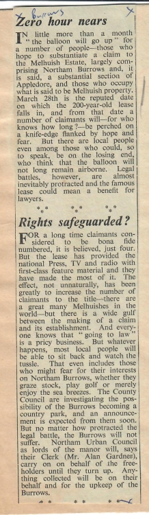 Inevitably the land had passed through many hands during the intervening two centuries and estates had been broken into smaller parcels and sold on. There had been a great deal of development including much of the town of Appledore and the seaside resort of Westward Ho! In 1895 the lordship of the manor had been acquired by the Royal North Devon Golf Club and their golf course occupied the Northam Burrows. If all of the leased estate was to be claimed by the heirs of Thomas Melhuish in 1970, a lot of people were going to worry about the impact on their properties. This was first highlighted at a meeting of the potwallopers of Northam as can be seen in the adjoining newspaper article from the Western Morning News dated 22 Oct 1938.
