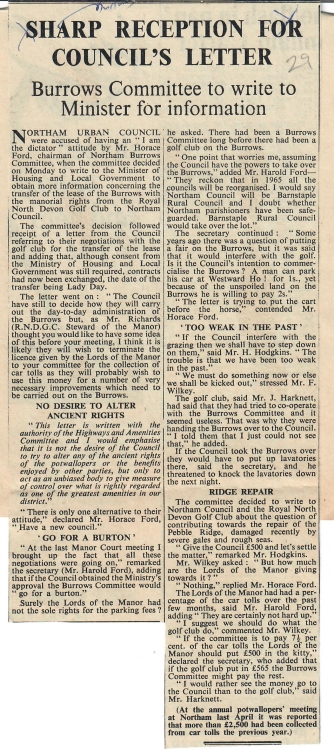 Inevitably the land had passed through many hands during the intervening two centuries and estates had been broken into smaller parcels and sold on. There had been a great deal of development including much of the town of Appledore and the seaside resort of Westward Ho! In 1895 the lordship of the manor had been acquired by the Royal North Devon Golf Club and their golf course occupied the Northam Burrows. If all of the leased estate was to be claimed by the heirs of Thomas Melhuish in 1970, a lot of people were going to worry about the impact on their properties. This was first highlighted at a meeting of the potwallopers of Northam as can be seen in the adjoining newspaper article from the Western Morning News dated 22 Oct 1938.
